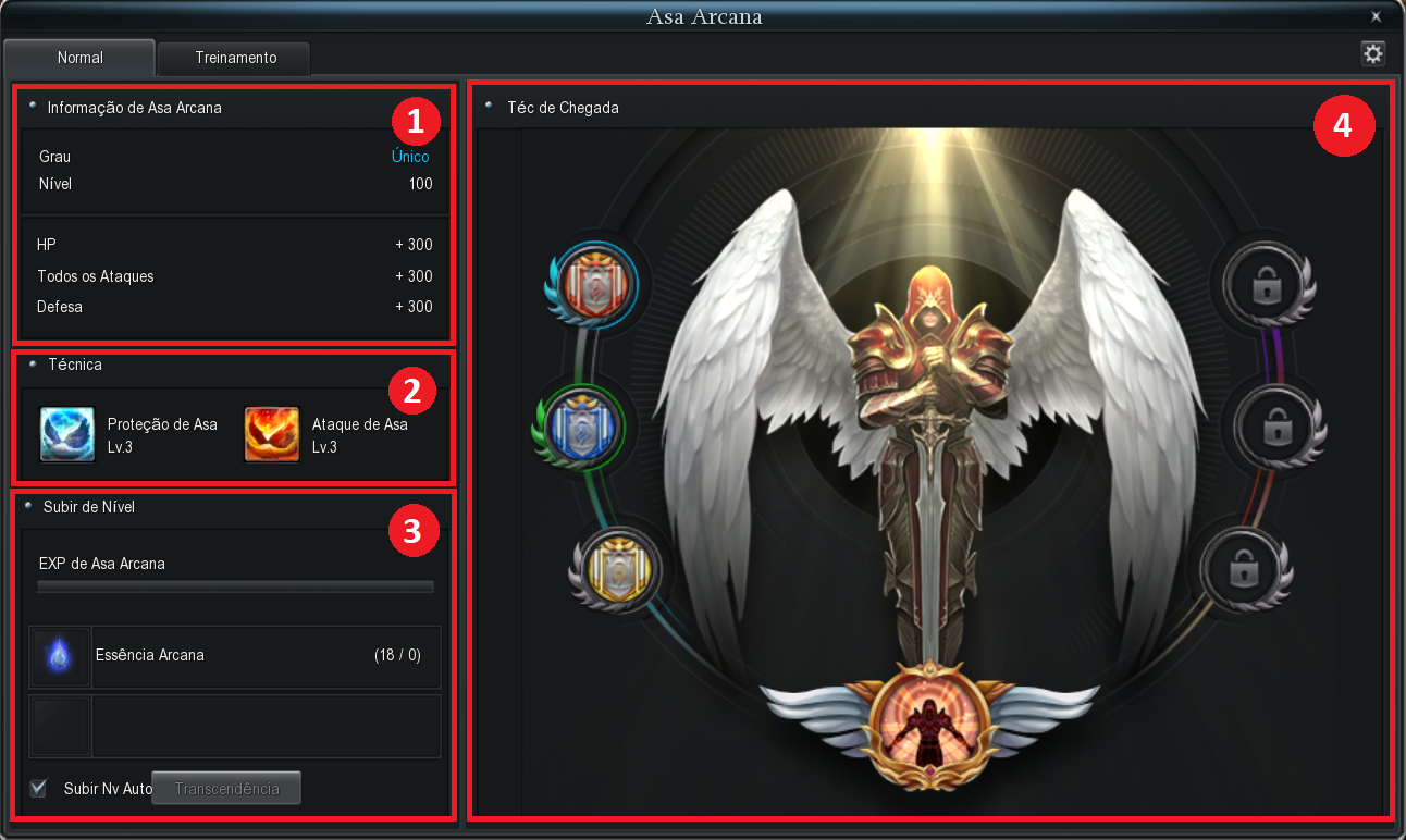 Exibe a EXP da Asa Arcana atual e os materiais necessários para subir de nível. O botão de Transcender é ativado quando o jogador atinge o Nível 100 de cada Grau da Asa.