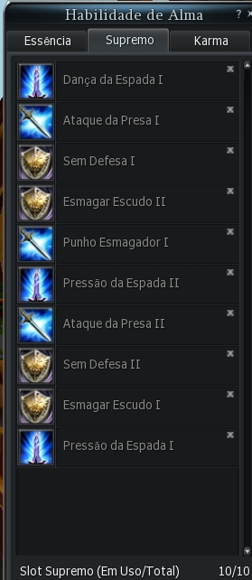 A segunda aba da janela de Habilidades da Alma possui 3 slots para serem preenchidos com as Runas Supremas. Antes de mais nada, deixo claro que o impacto das runas supremas é pequeno comparado a outros investimentos devido à chance de ativação muito pequena das mesmas, 1 ou 2%, portanto a aquisição das runas deve ser feita sem pressa, quando já possuir um bom set e armas decentes.